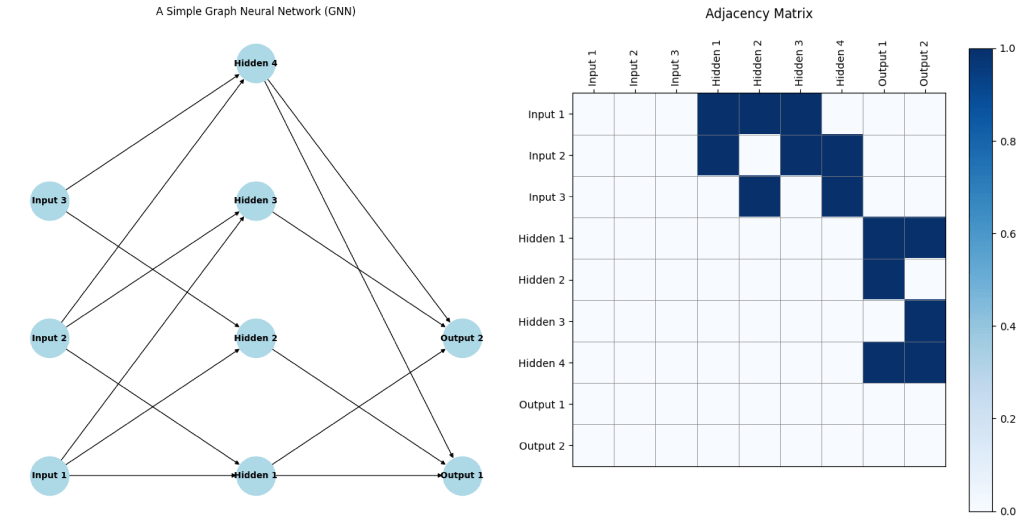 In a GNN, each node (or vertex) represents an entity, and each edge represents a relationship between entities. The GNN learns to propagate information through the graph, allowing it to capture both local and global dependencies. A critical component of GNNs is the adjacency matrix, which represents the connections between nodes in the graph. The adjacency matrix is a square matrix where each element indicates whether a pair of nodes is connected by an edge. This matrix is essential for defining the structure of the graph and for the operations that propagate information between nodes during the learning process.